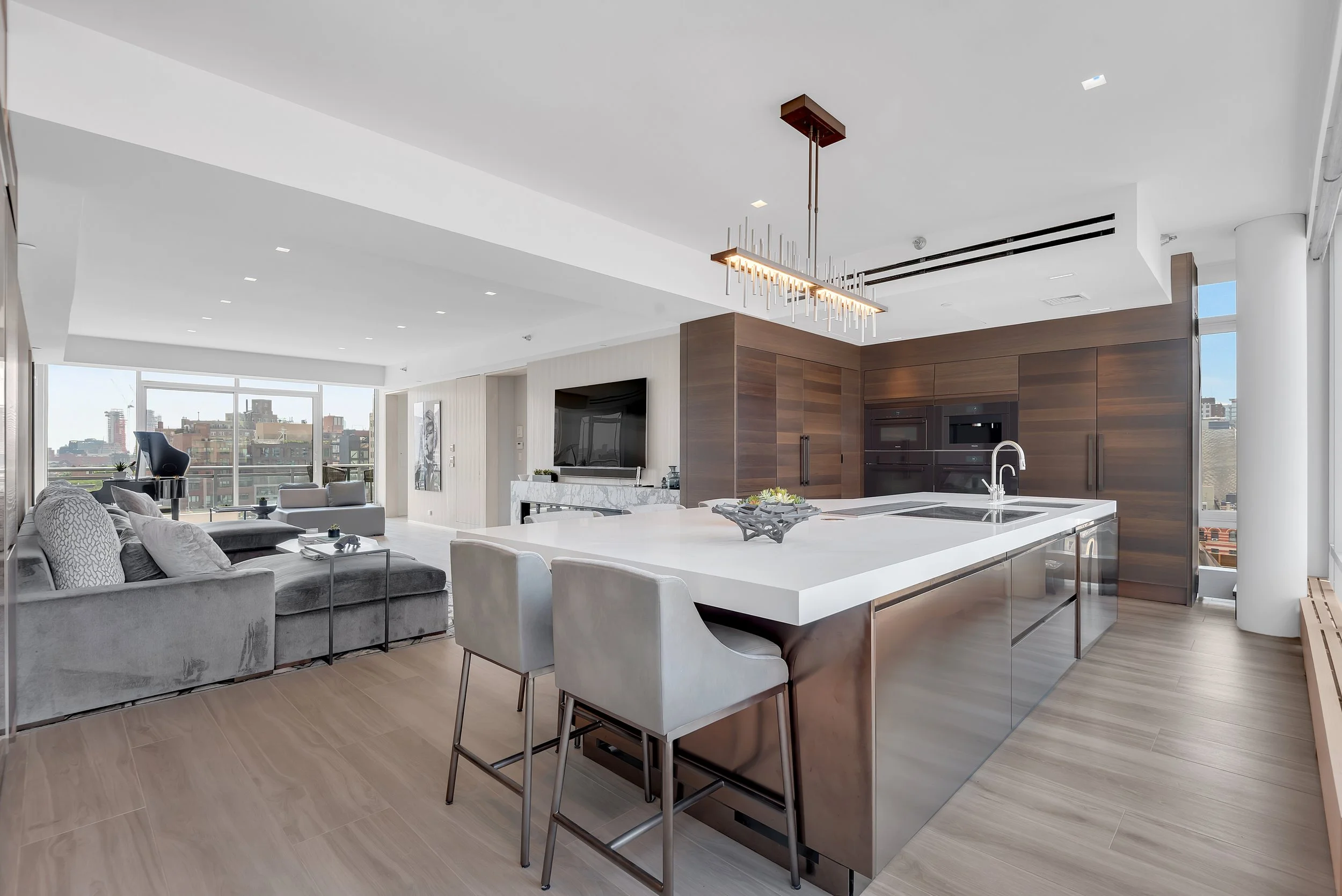 This West 17th Street penthouse is a case study in how premium real estate photography and thoughtful staging can translate design intent into high-performing listing media. The open-plan kitchen and living room are organized around a bold, waterfall island with crisp stone and warm wood cabinetry. Clean lines, integrated equipment, and controlled lighting keep the composition modern and intentional, giving every image a clear focal point while preserving depth across the full tour.